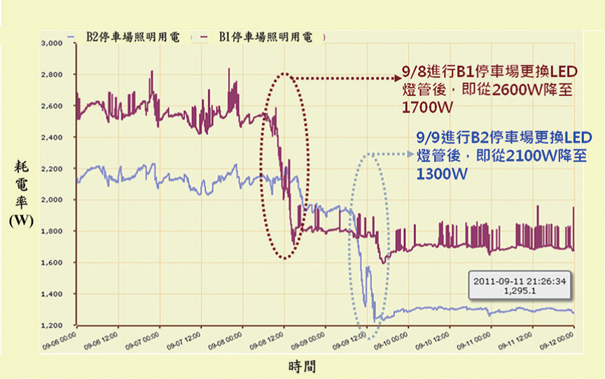 此案例在改善前已裝置雲端能源管理系統,因此可利用雲端能源管理系統進行改善前基準線及改善後節能效益的計算。由圖四可知,分別於9/8日及9/9日進行B1及B2停車場照明系統汰換工程。