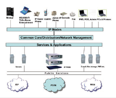 核心交換器串連整個客房上網網路點,使得資訊管理部門能在任何時間監看資訊網路的功能性。這也是HSIA伺服器相互連接以分發網路頻寬並控制的地方。廣大分布的電信網路分機則被嚴謹計算,以確保所有客房(每個房間有3台電話接點)以及飯店內的所有服務據點,包括所有員工工作站都能被聯繫。