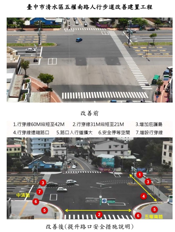 內政部表示,為使道路不再挖挖補補,天空不再纜線飛舞,近4年來透過前瞻基礎建設「提升道路品質計畫」第一階段,共209.4億元的補助,全台已完成851項道路品質改善工程,改善約493公里的道路。例如,台中市清水區五權南路人行步道改善建置工程,透過增設行人庇護島、斑馬線遠離路口、路口人行道擴大、天空纜線下地、人行道違章及私設斜坡道拆除、立桿減量等措施,提升行人通行安全與整體道路品質,獲選為道路改善優質示範案例。