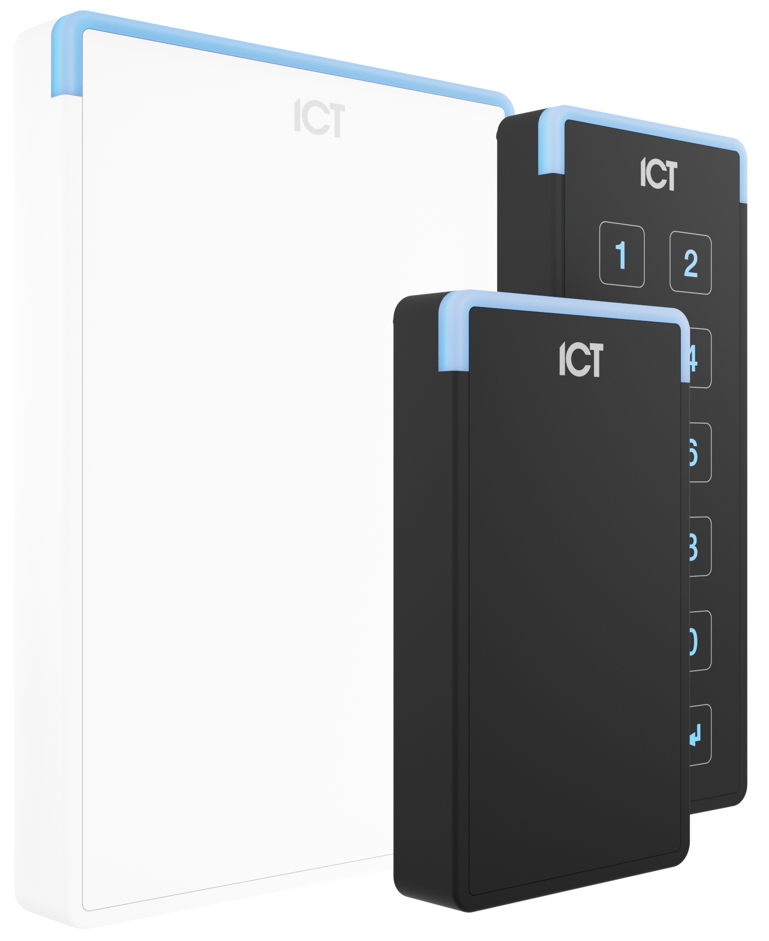 ICT最新tSec讀卡機除了多技術智慧卡外,也支援藍牙和NFC,因此使用者可透過智慧手機的行動憑證解鎖開門,實現最大便利性。tSec系列採用靈活的RS-485通訊協議、具備IP65保護等級和可選卡片(鑰匙扣),推出3種尺寸和黑、白兩色,以因應用戶需求。