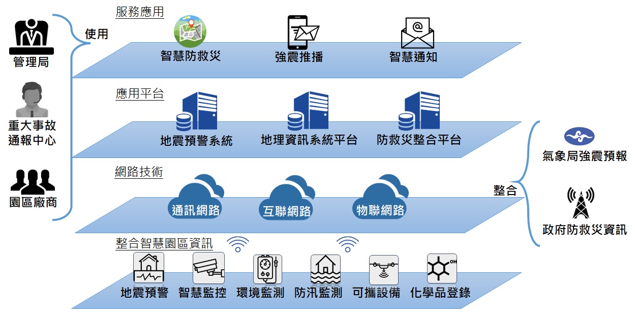 在強化企業發展的「韌性」上,安全及風險的預防與管理是重要關鍵。南科為達智慧防救災需求,應用物聯網結合園區各項智慧IoT系統(如下列5大項),提供管理局及園區廠商使用(參見圖1);並整合至視覺化化學品監控管理系統,於災害發生時,快速整合情資並提供予應變指揮官,俾利救災單位快速反應(參見圖2)。