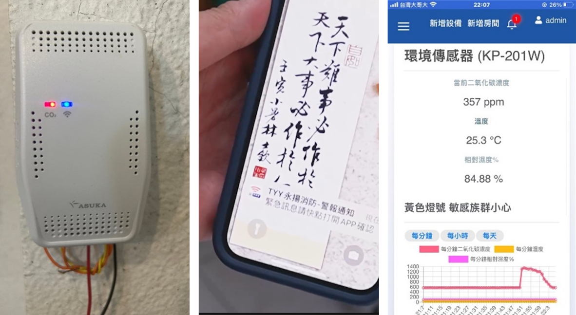 2濃度、溫度、影像、火災位置,以及預先登錄的使用者資訊(包含人事時地物),通報保全(監管平台)及地方消防機關(已與本協會合作並完成系統介接者)。