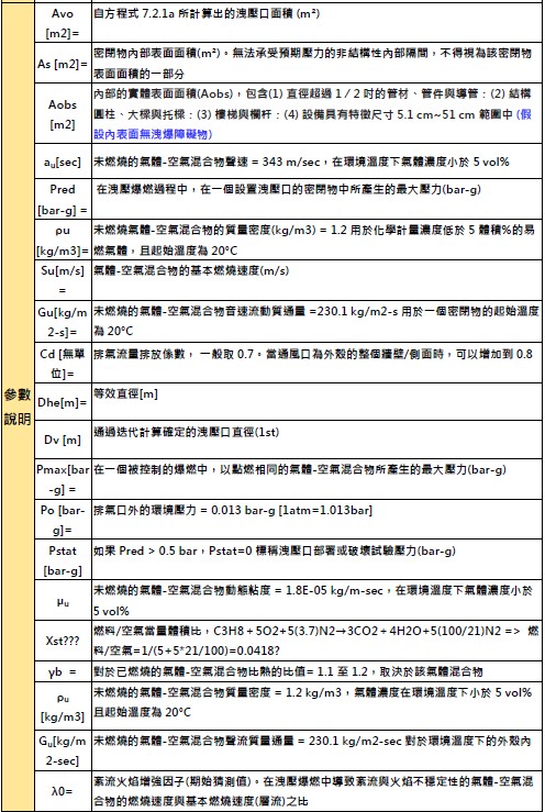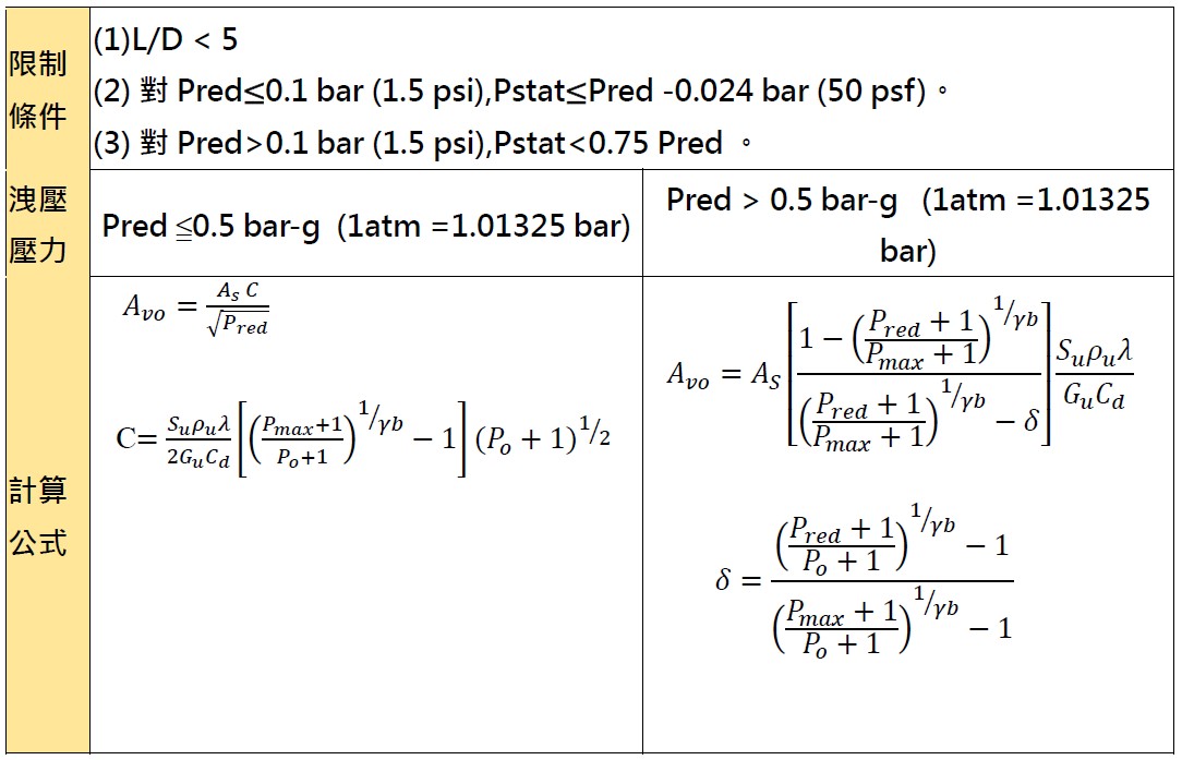 - 計算依據NFPA 68 Ch7 計算,必須注意長徑比(最常邊/等效直徑) < 5 。註: FM 1-44 要求亦同。