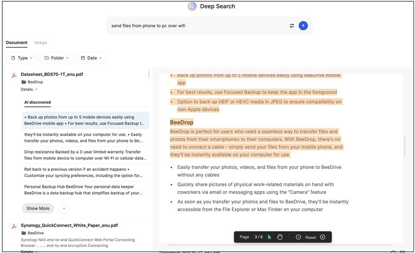 (右圖)智慧搜尋引擎 Deep Search,目前適用於 AI 智慧型隨身 SSD BeeDrive,方便使用者輕鬆搜尋存放的各種照片與檔案。