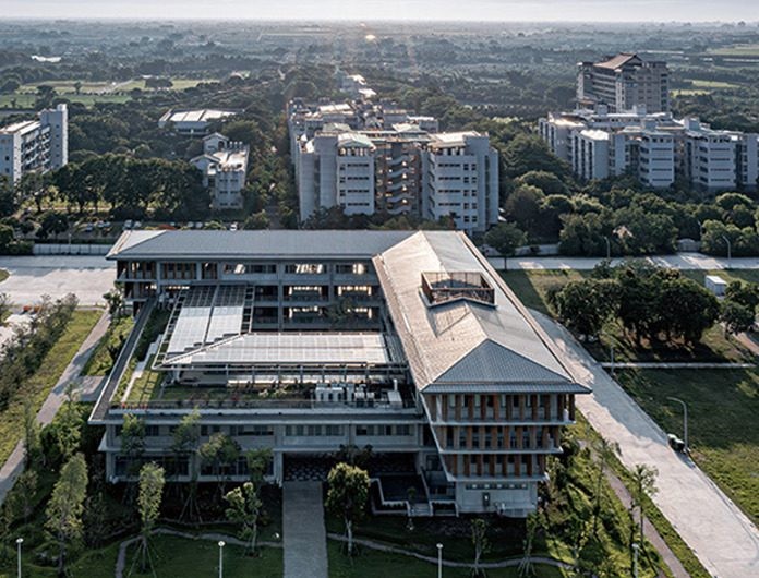 (如右圖),一座整合教學、行政與圖資機能的多元合院式建築,在 SSDC 澄毓綠建築設計顧問的專業輔導下,先後取得美國 LEED綠建築認證金級 與台灣 EEW綠建築標章黃金級,也為這片土地寫下新的篇章。