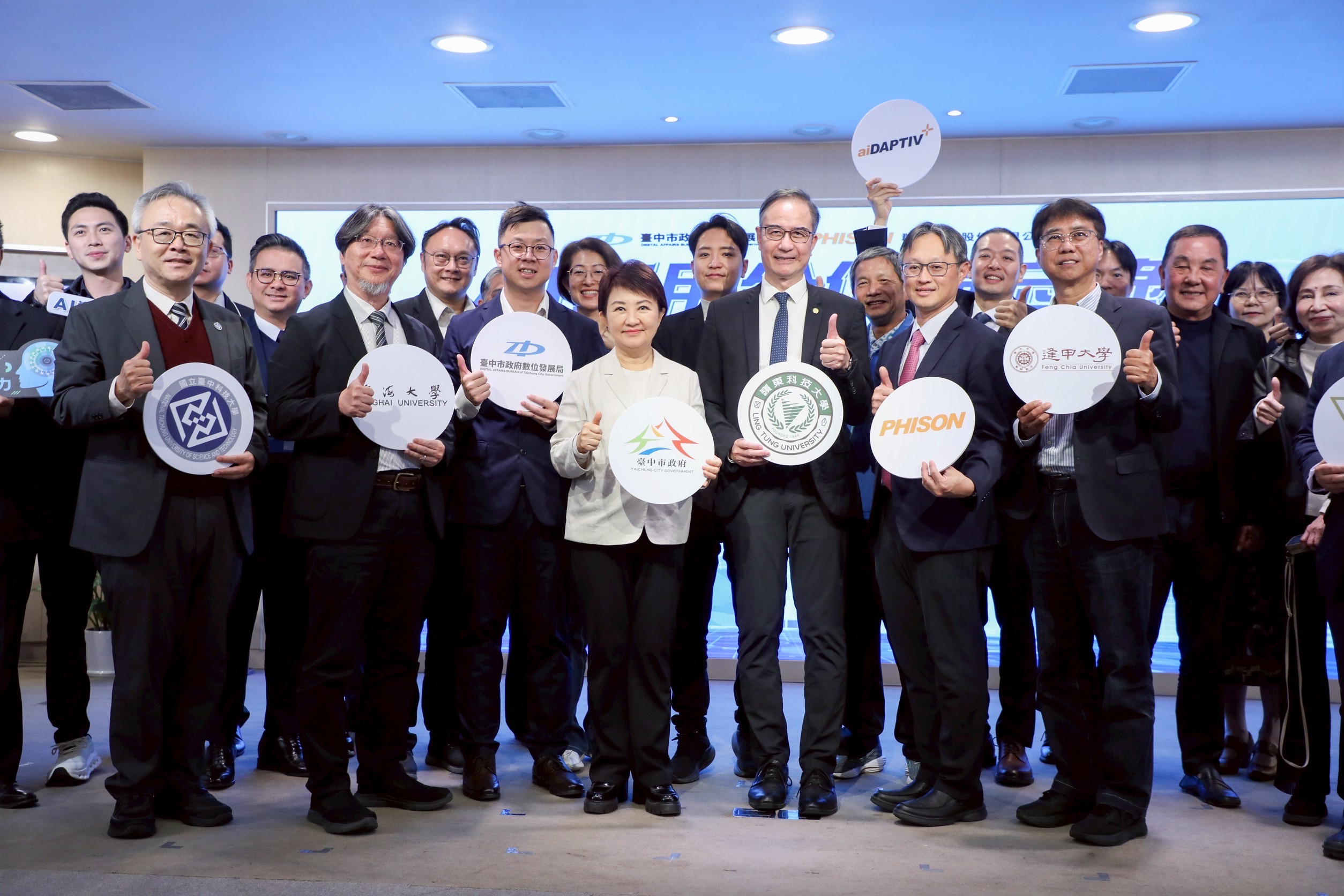 台中市政府數位發展局3月4日與科技大廠群聯電子舉行「AI應用合作備忘錄(MOU)」簽署記者會。在台中市長盧秀燕(左二)與群聯電子創辦人潘健成(右二)的共同見證下,正式啟動雙方在智慧市政領域的深度合作,更象徵台中邁向「AI智慧城市」的重要里程碑 。